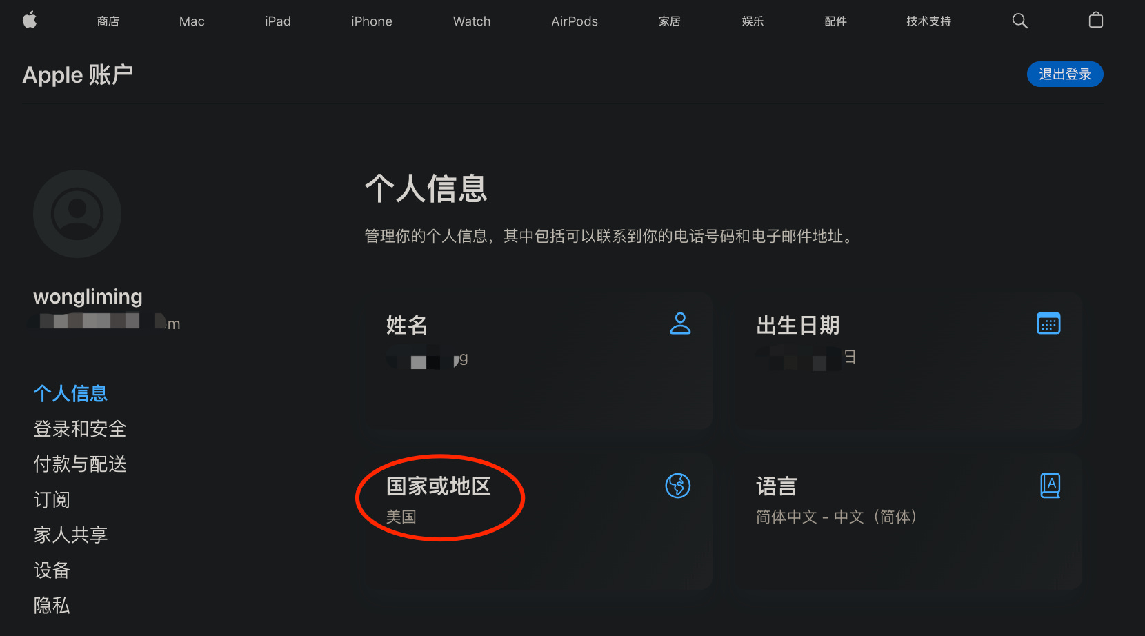 2.左侧“个人信息”,点击“国家或地区”;