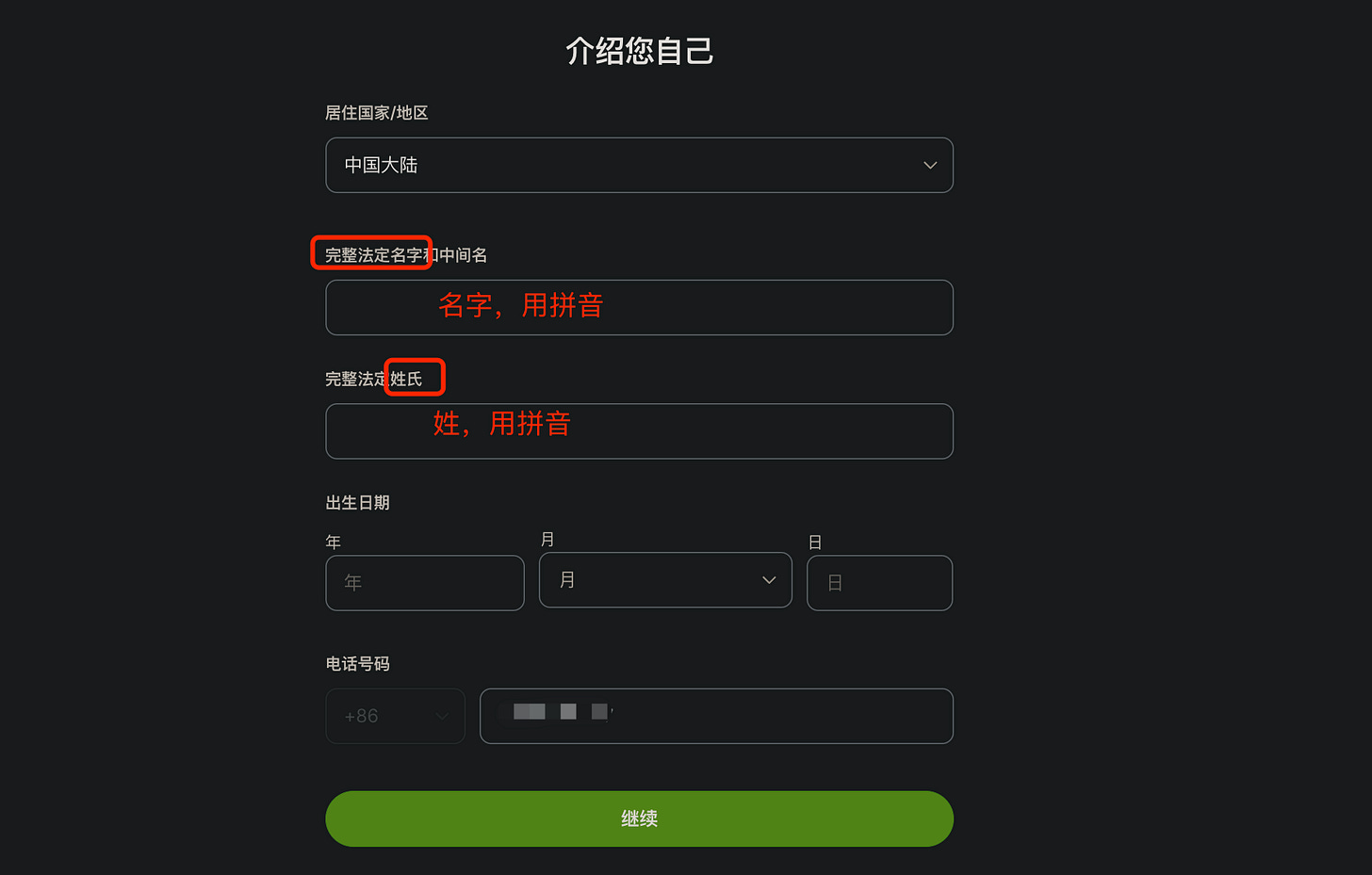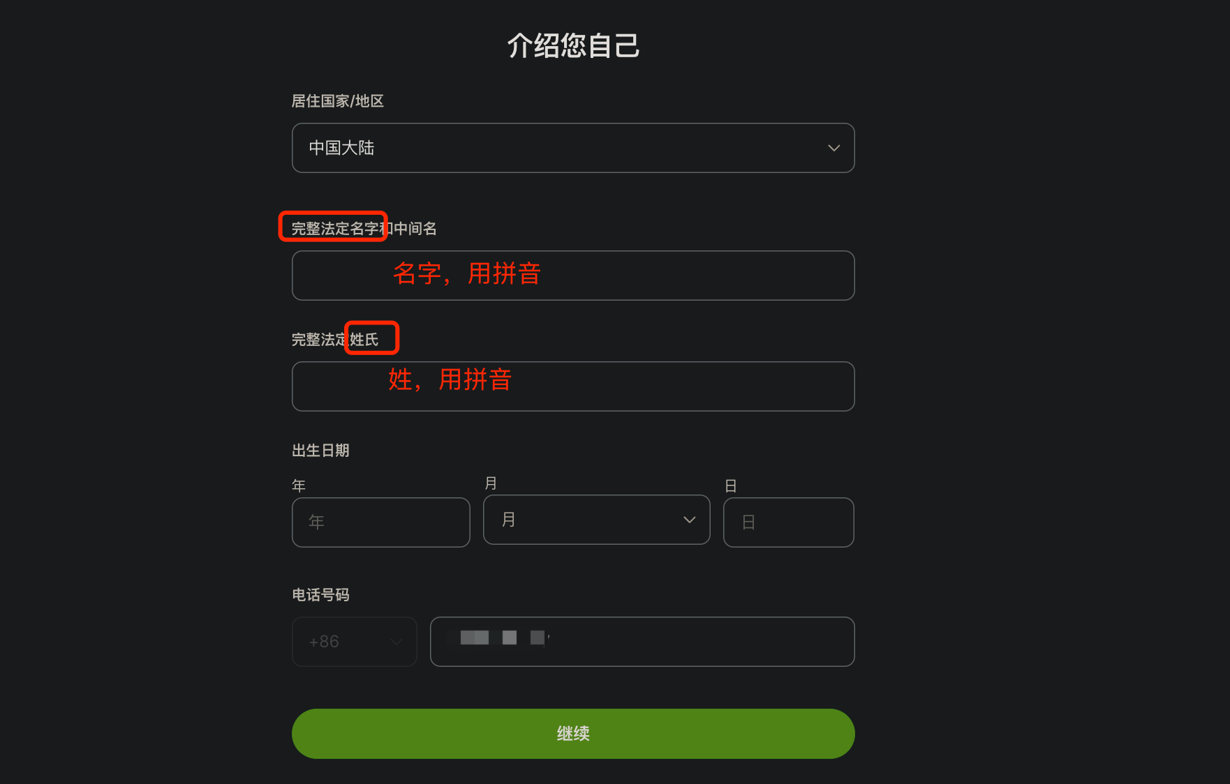 注意,姓和名,要用拼音,且不要填反了,有些用户是英文界面,把fist name 和last name 搞反了。